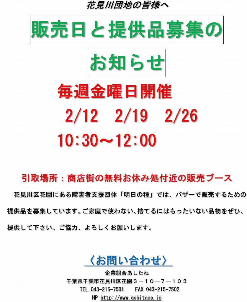 花見川団地の皆様へ:販売日と提供品募集のお知らせ